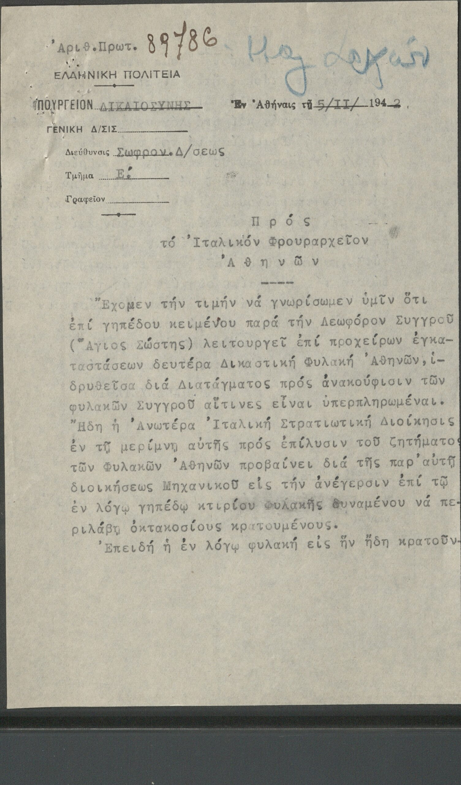 [3] ΓΑΚ, Αρχείο Υπουργείου Δικαιοσύνης, Φάκελος 177, Ιταλικόν Φρουραρχείο Αθηνών προς την Γενικήν Διεύθυνσιν των Φυλακών, Αθήναι, 4.8.1941