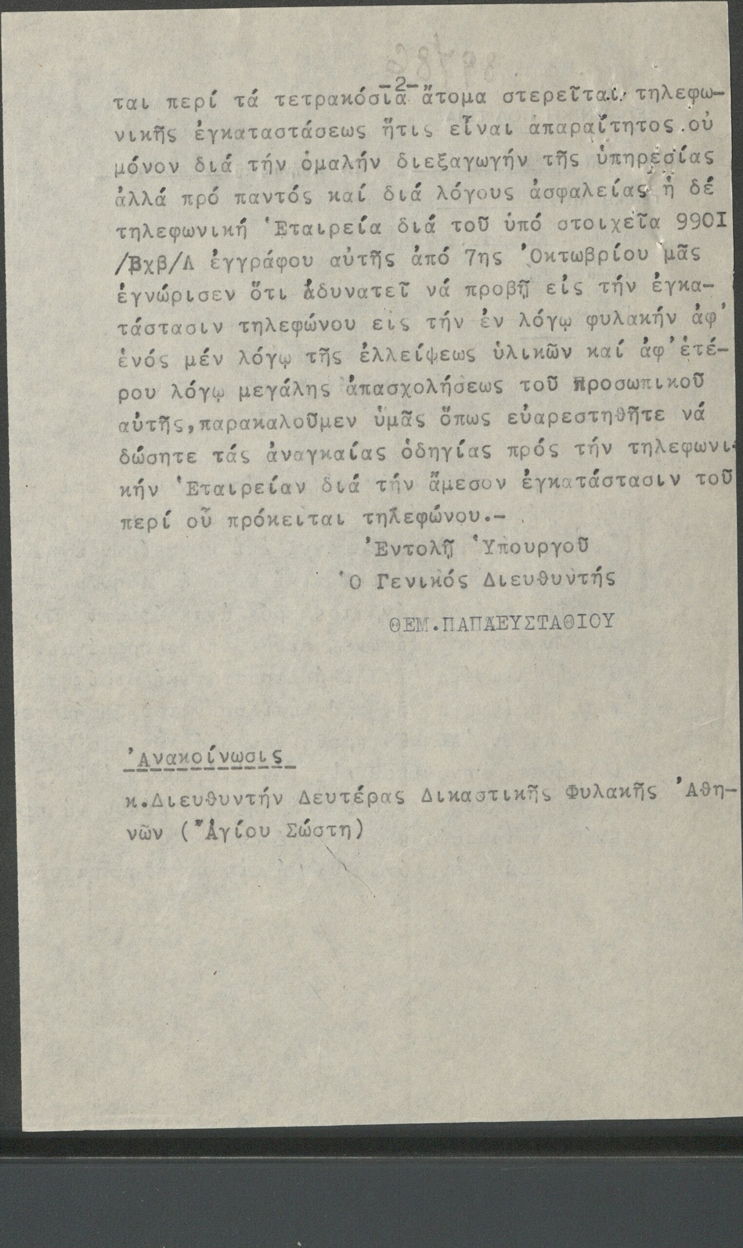 [5] ΓΑΚ, Αρχείο Υπουργείου Δικαιοσύνης, Φάκελος 174α, Υπουργείο Δικαιοσύνης/Διεύθυνσις Σωφρονιστικής Διοικήσεως προς την Ελληνικήν Τηλεφωνικήν Εταιρείαν, αρ. πρωτ. 70066, Αθήναι, 25.8.1942.