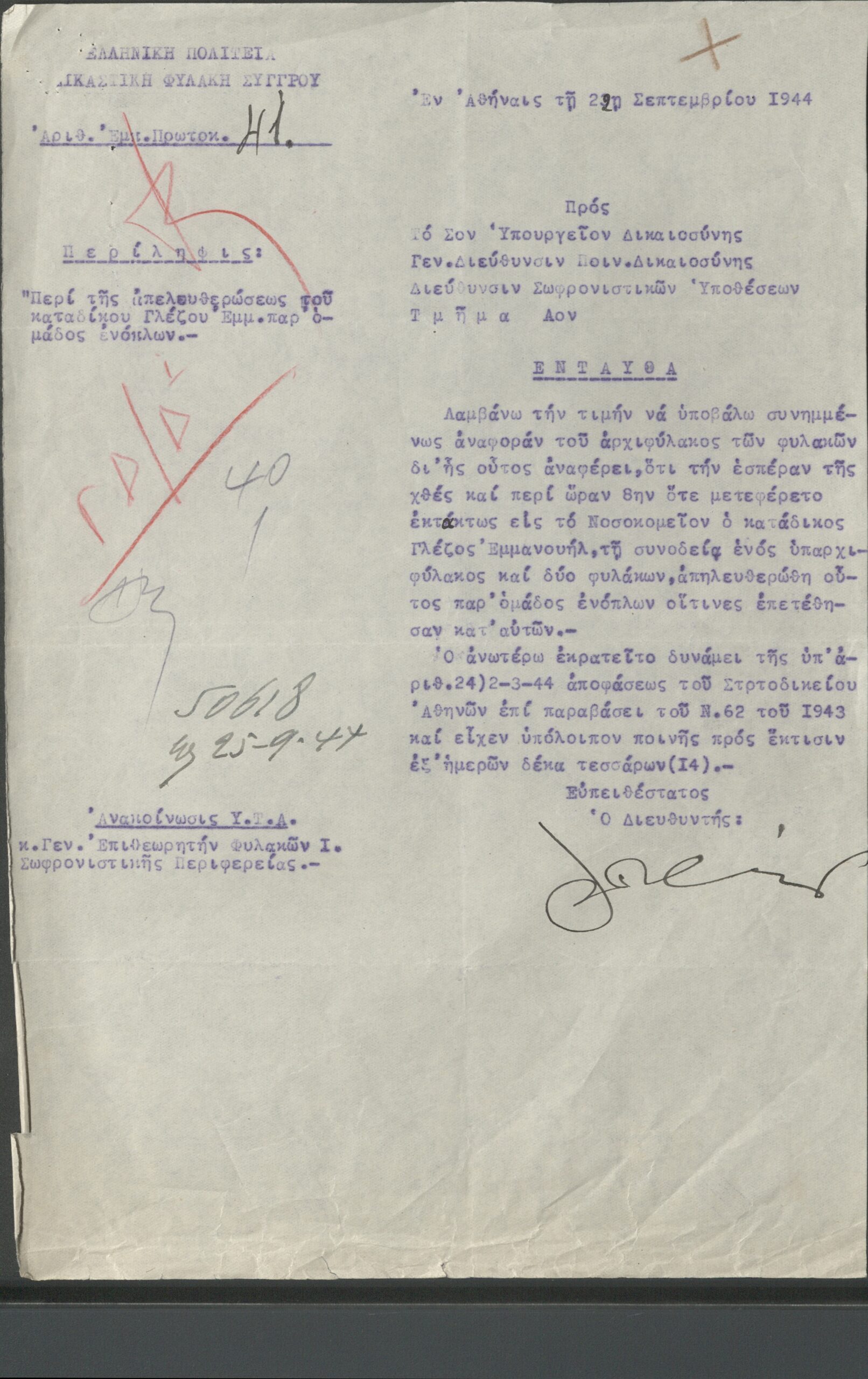[6] ΓΑΚ, Αρχείο Υπουργείου Δικαιοσύνης, Φάκελος 174β, Υποφάκελος 26, Υπουργείο Δικαιοσύνης/Διεύθυνσις Σωφρονιστικής Διοικήσεως προς Υπουργείο Εσωτερικών/Γ’ Γενική Διεύθυνση/Δ/ση Ασφαλείας, αρ. πρωτ. 32050, Αθήναι, 13.6.1944
