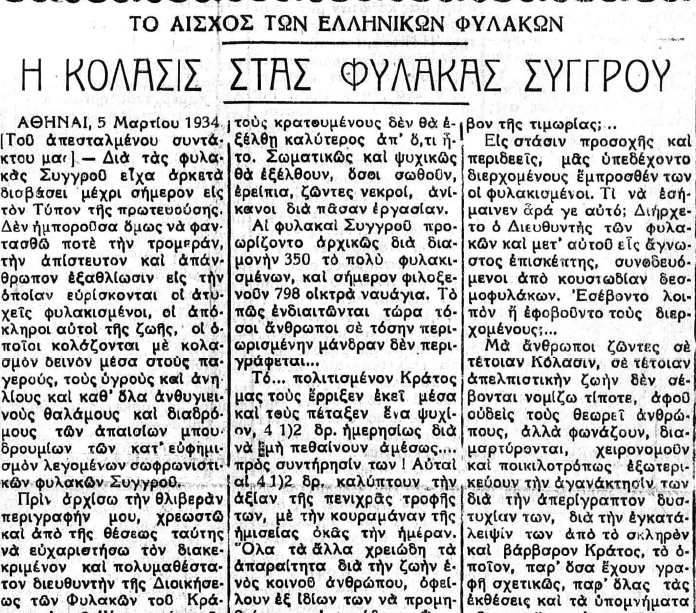 [2] «Η κόλασις στας Φυλακάς Συγγρού», εφημ. Η Δράσις, 10.3.1934.