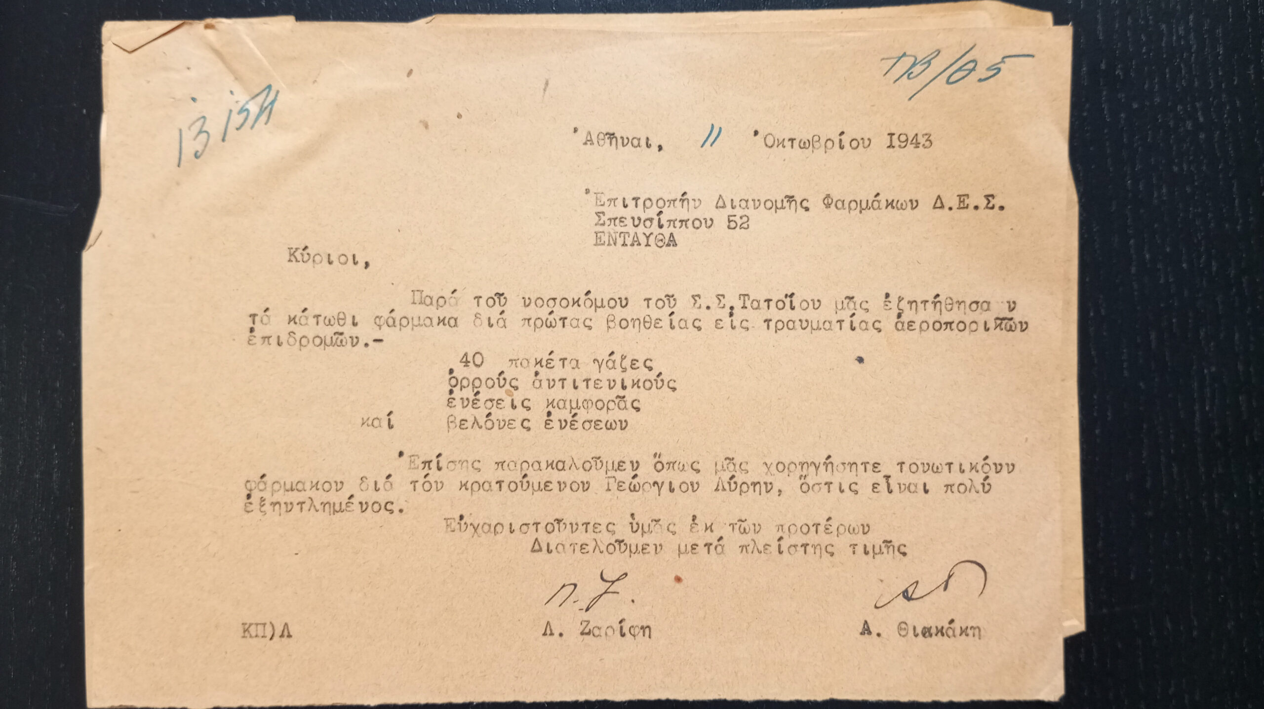 [3] DAEES Archive, TB No. 15, L. Zarifi to DES Drug Distribution Committee, No. 13154, Athens, October 11, 1943.